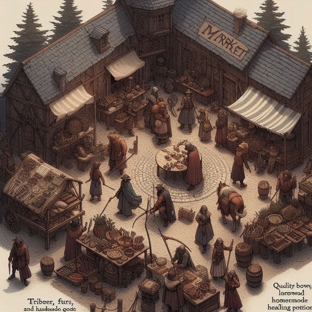- Malé, ale rušné náměstí, kde se denně obchoduje s dřevem, kožešinami, bylinami a ručně vyráběným zbožím. Místní řemeslníci jsou hrdí na svou práci a často zde nabízejí své výrobky, od kvalitních luků až po domácí léčivé lektvary. Trh je také místem, kde se pořádají slavnosti a soutěže.